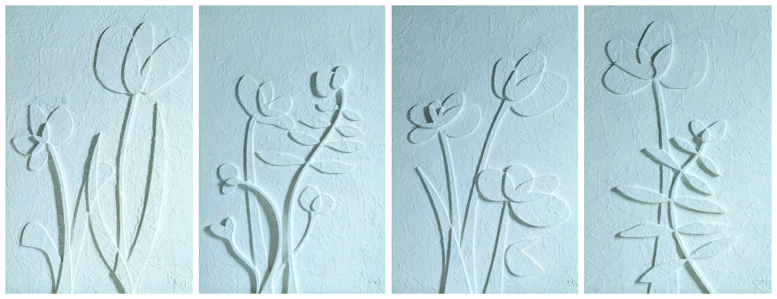 Plastering over hand-shaped and laser-cut forms allows me to create modern, bias relief decor. These large-scale pieces catch the eye with depth and details, bringing organic design, neutral colors and modern elegance to any room.